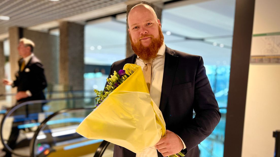 Aant Jelle Soepboer (NSC) met een bos bloemen in de Tweede Kamer
