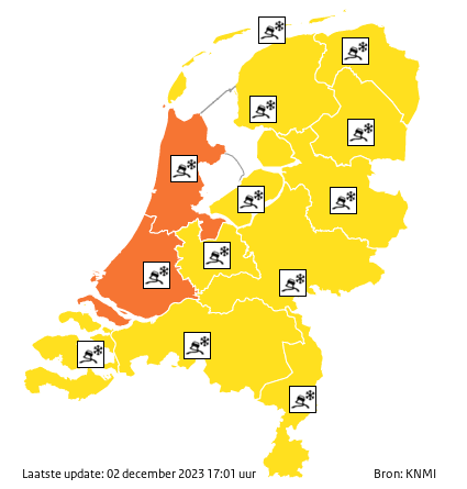 In Fryslân, Groningen, Flevoland, Utrecht en Zeeland heeft het KNMI voor zaterdagavond code geel voor plaatselijke gladheid door bevriezing afgegeven. Hierdoor kan schade en gevaar ontstaan als gevolg van een gladde weg.