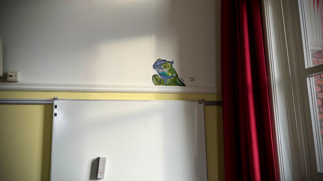 Die verhalen zijn door de hele school te zien. Sommige staan groot op de muren, maar op de tweede verdieping zit in het biologielokaal in een klein hoekje een schilderij van een leguaan verstopt. Het is de leguaan Lena, die woonde in het lokaal.