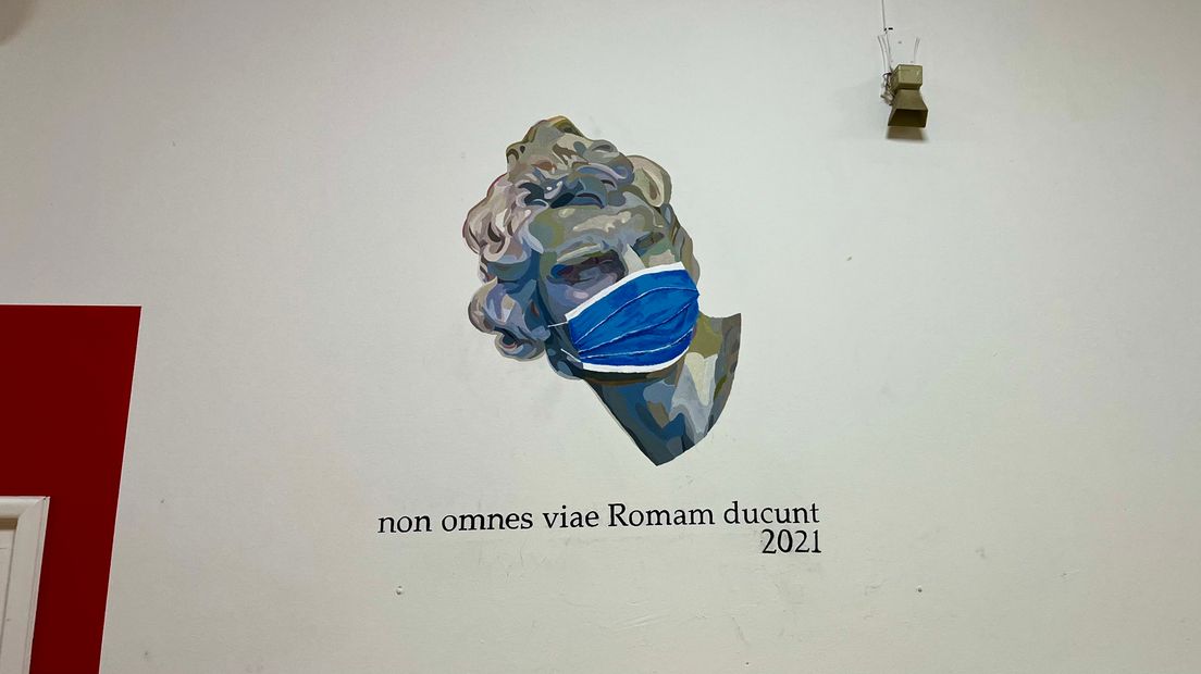 Oud-leerling Thirza van Balen werkte mee aan de David van Bernini, een beroemd schilderij in Rome. Maar hier heeft hij een mondkapje op. “Eronder staat de spreuk: Alle wegen leiden naar Rome, maar dat is dus niet altijd zo”, zegt Thirza. “Daarom staat er ‘non’ voor. Niet alle wegen leiden naar Rome.”