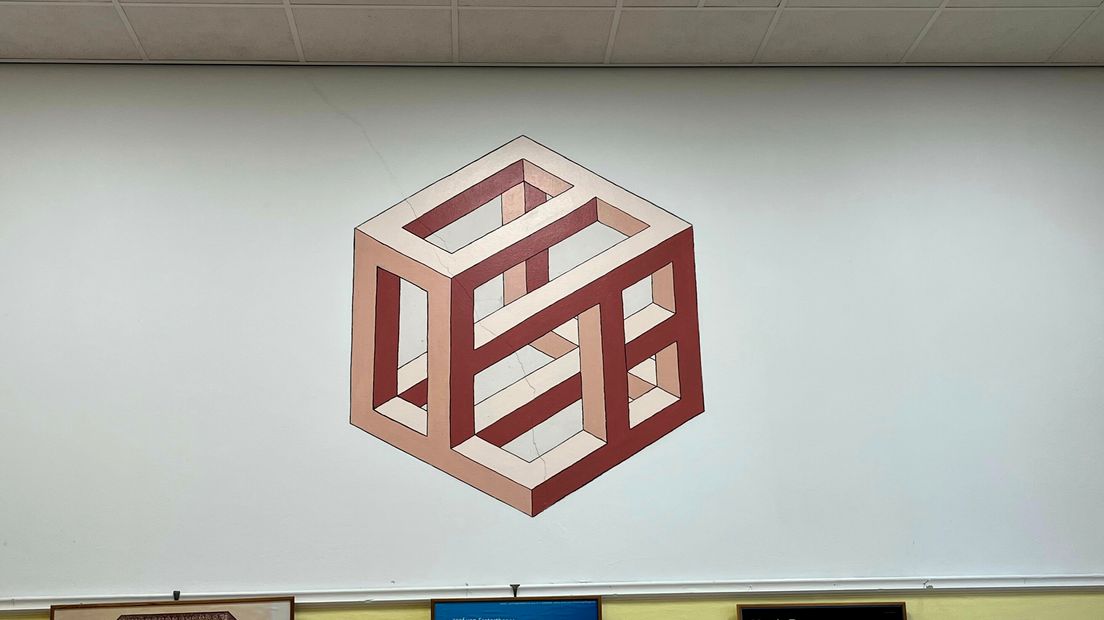 “Dit is gebaseerd op Escher”, zegt hij over een schilderij in het wiskundelokaal. “En de leerlingen hebben er hun jaartal in verstopt. Jaren heb ik er naar gekeken, maar sinds kort weet ik dat pas!”