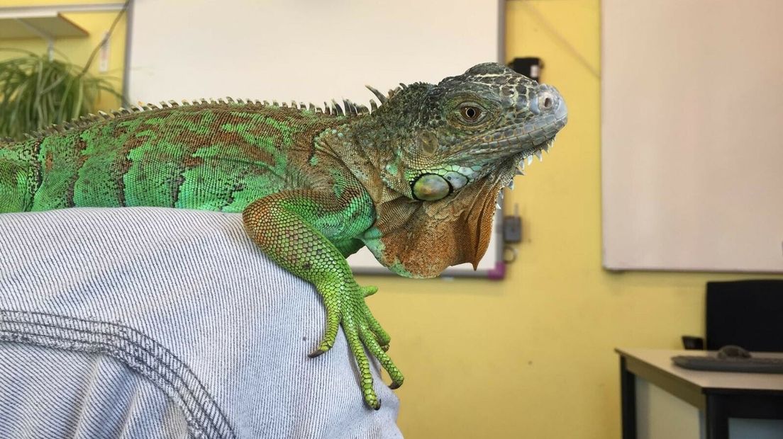 Goed verstopt in de hoek van het lokaal: Lena de Leguaan