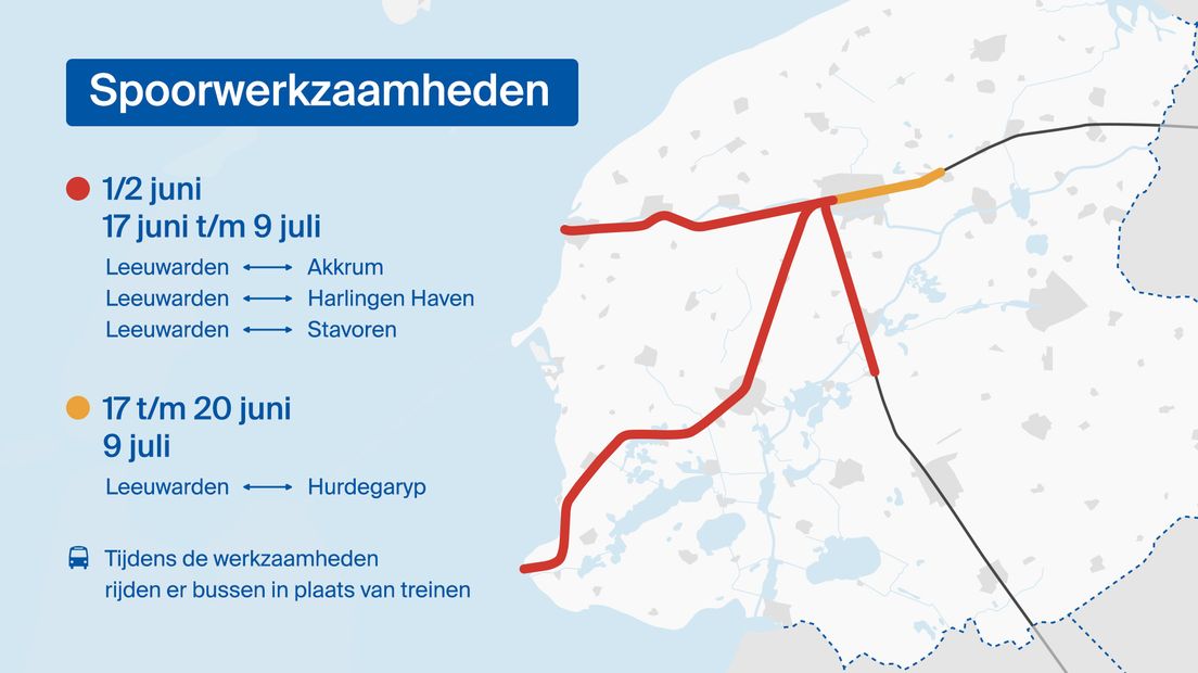 Tot maandagmorgen 02:00 uur rijden er vanuit Leeuwarden bijna geen treinen vanwege weerkzaamheden aan het spoor. Door werkzaamheden tussen Akkrum en Leeuwarden rijden er bussen; ook tussen Leeuwarden en Stavoren rijden er bussen en tenslotte tussen Leeuwarden en Harlingen Haven rijden er bussen. Extra reistijd bedraagt ongeveer 30-60 minuten.