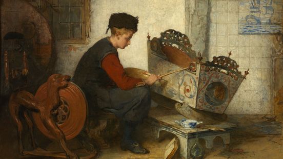 Een ander werk van Bisschop dat Hindeloopen laat zien: ‘Jongen die een wieg beschildert’, 1899-1901.