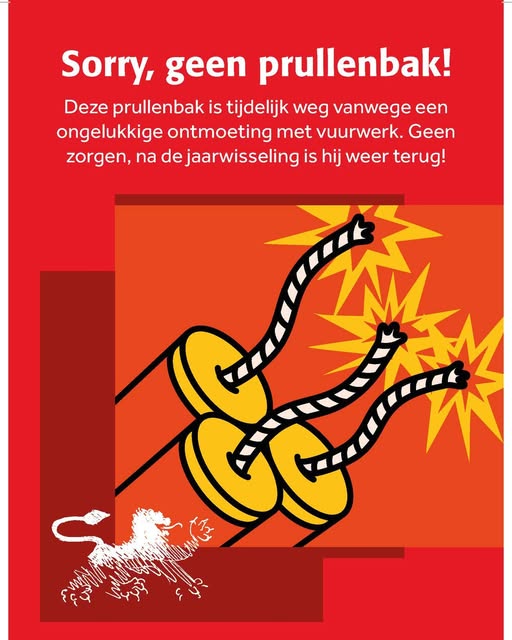 Sorry, geen prullenbak! Deze prullenbak is tijdelijk weg vanwege een ongelukkige ontmoeting met vuurwerk. Maar geen zorgen, na de jaarwisseling is hij weer terug! Help ons gemeente Leeuwarden schoon te houden en neem je afval mee. Dankjewel!
