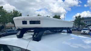Een auto met een witte bak op het dak waar acht camera’s in zitten. Zo ziet de nieuwe scan-auto van de stadstoezichthouders van de gemeente Leeuwarden er uit.