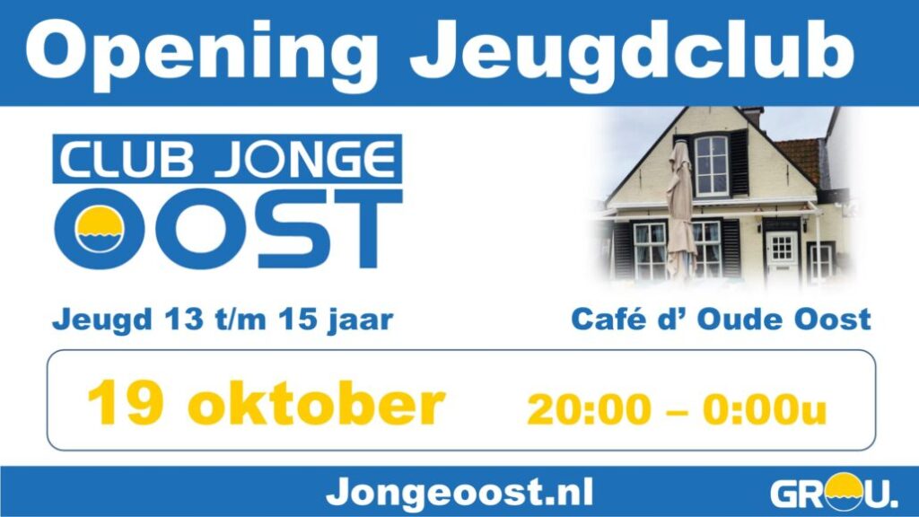Al jaren is er in Grou behoefte aan een ontmoetingsplek in de vorm van een jeugdsoos. Een initiatiefgroep zet zich in om deze situatie te verbeteren door een jeugdclub te realiseren die jongeren van 13 tot en met 15 jaar een veilige en stimulerende omgeving biedt. Zaterdag 19 oktober is deze groep jongeren onder de vlag van ´De Jonge Oost´welkom in de tijdelijke locatie van voorheen café d´Oude Oost naast restaurant Oostergoo. Inmiddels is er ook een spiksplinternieuwe website www.jongeoost.nl met relevante info.
