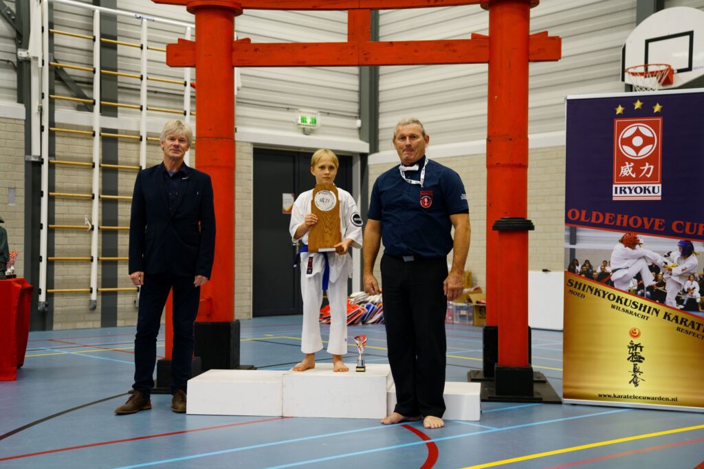 De hele dag hielt een 3-koppige jury bestaande uit Arend Mud (Goutum), Jaap Cuperus (Leeuwarden) en Jesse Swart (Hallum) de deelnemers nauwlettend in de gaten en beoordeelde hen op wilskracht, doorzettingsvermogen en respect. Uiteindelijk vonden ze Santiago Jansen (11) van Gym Zutphen hierin uitblinken en riepen hem uit tot winnaar van de Oldehove Cup-bokaal. “Santiago, toonde moed, wilskracht, hij moest de strijd aangaan met grotere tegenstanders, en respect ook voor de beslissingen van de scheidsrechter, die soms in zijn nadeel uitvielen. Dat alles in combinatie met tactisch slim en technisch uitgevoerde karatetechnieken, maakt hem een waardige ontvanger van de Cup”, aldus jurylid Arend Mud.