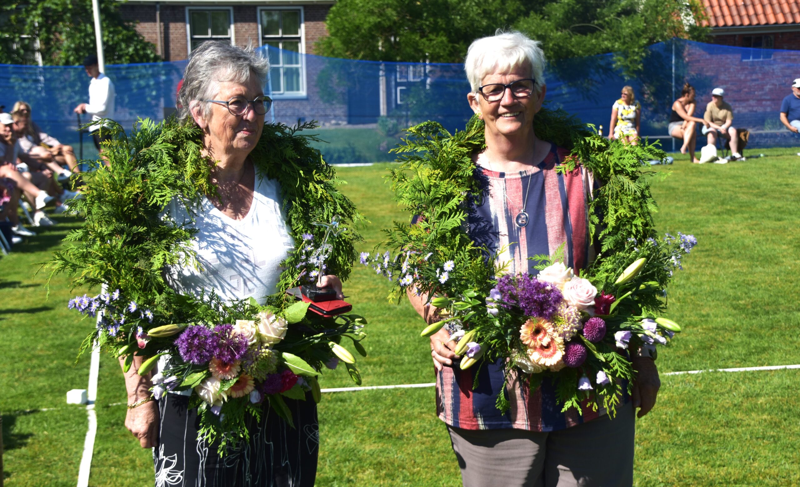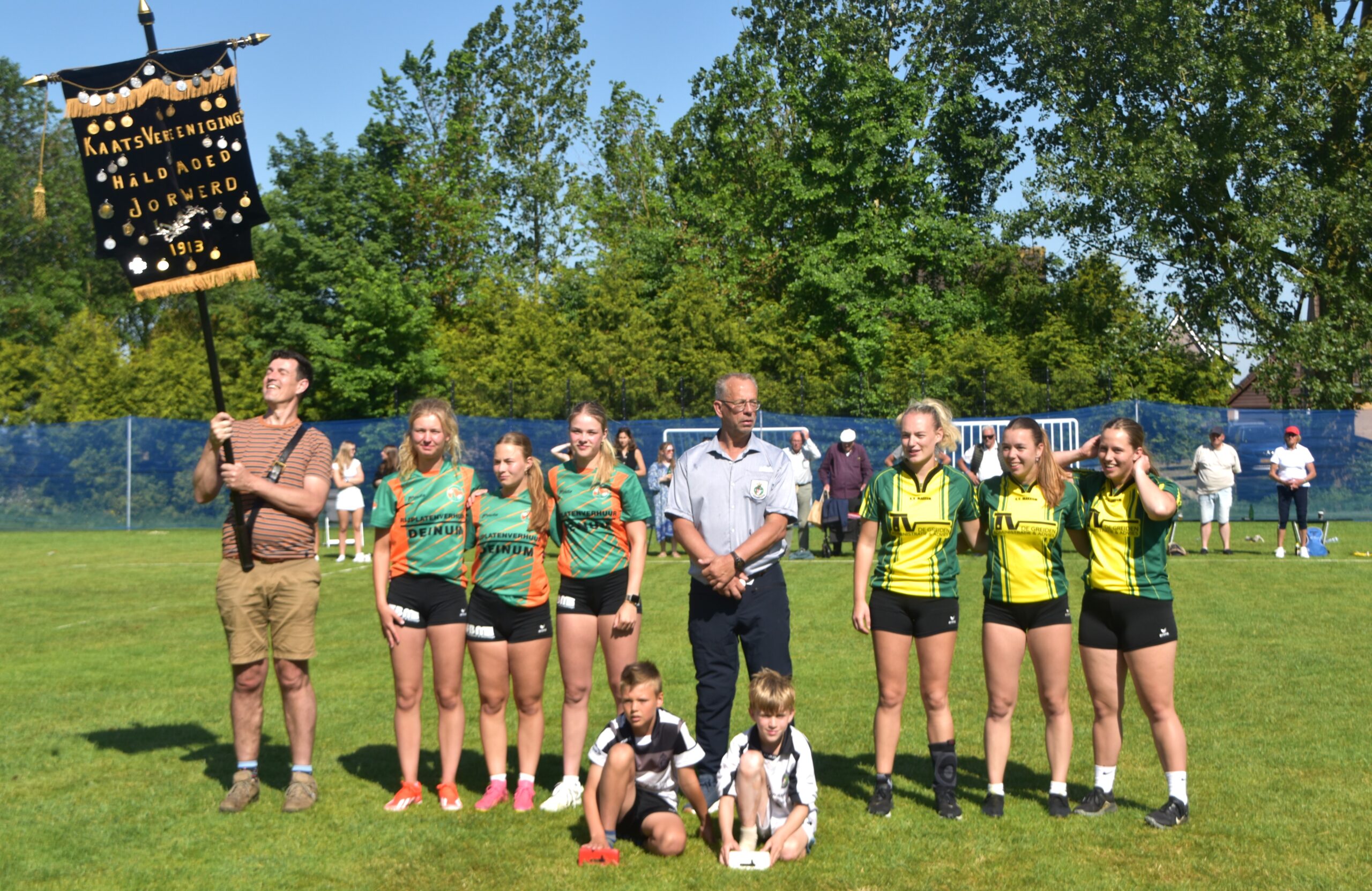 Het is vijftig jaar geleden dat in Jorwerd het dames kaatsen het levenslicht zag in wedstrijd verband. Van het winnende trio in 1974 werden Afke Siderius en Hennie Koldijk weer even in het zonnetje gezet. Helaas is derde maat van toen Eef Dijkstra niet meer onder ons. Zondag mocht de plaatselijke kaatsvereniging Hâld Moed dit lustrum vieren met de organisatie van het NK voor dames.