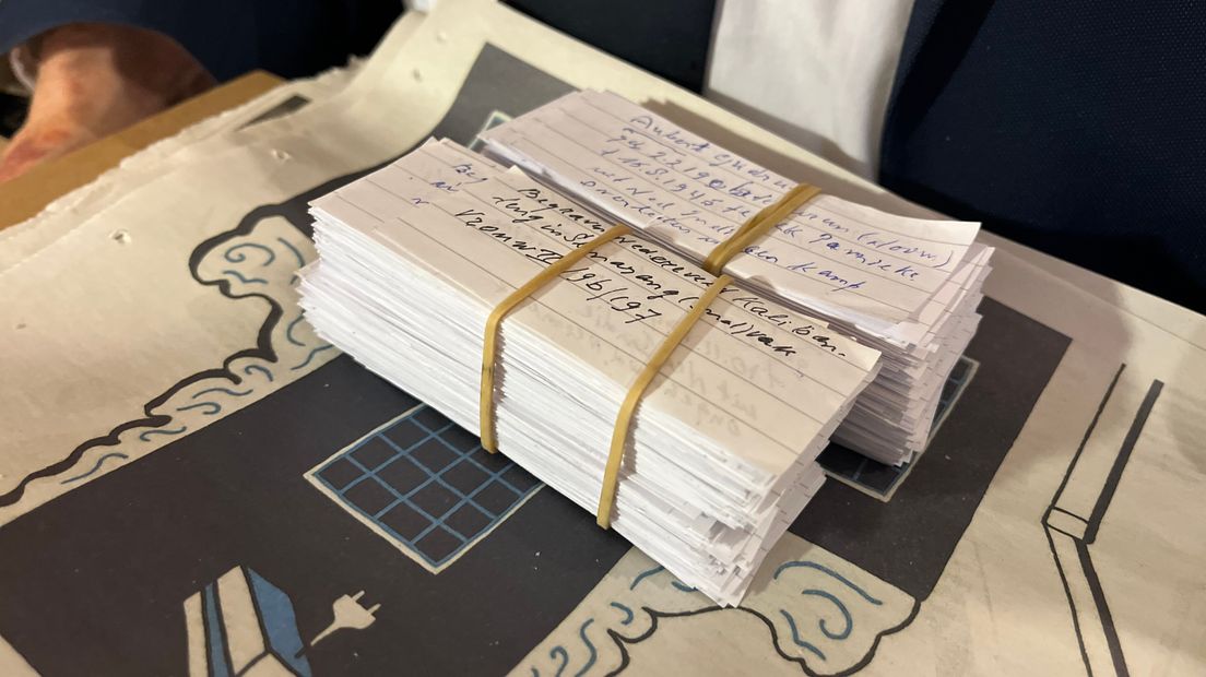 Kooistra schrijft alle gegevens op kleine kaartjes die naar het privémuseum in Loosdrecht worden gebracht. Daar worden ze in vitrines vol met foto’s, documenten en artikelen over het leven en werk van Kooistra geplaatst.