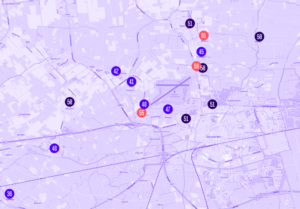 Het geluidsmeetnet rondom vliegbasis Leeuwarden. De twee grijze strepen zijn de start- en landingsbanen. De bolletjes zijn de meetpunten met daarin het aantal decibel op een willekeurig moment