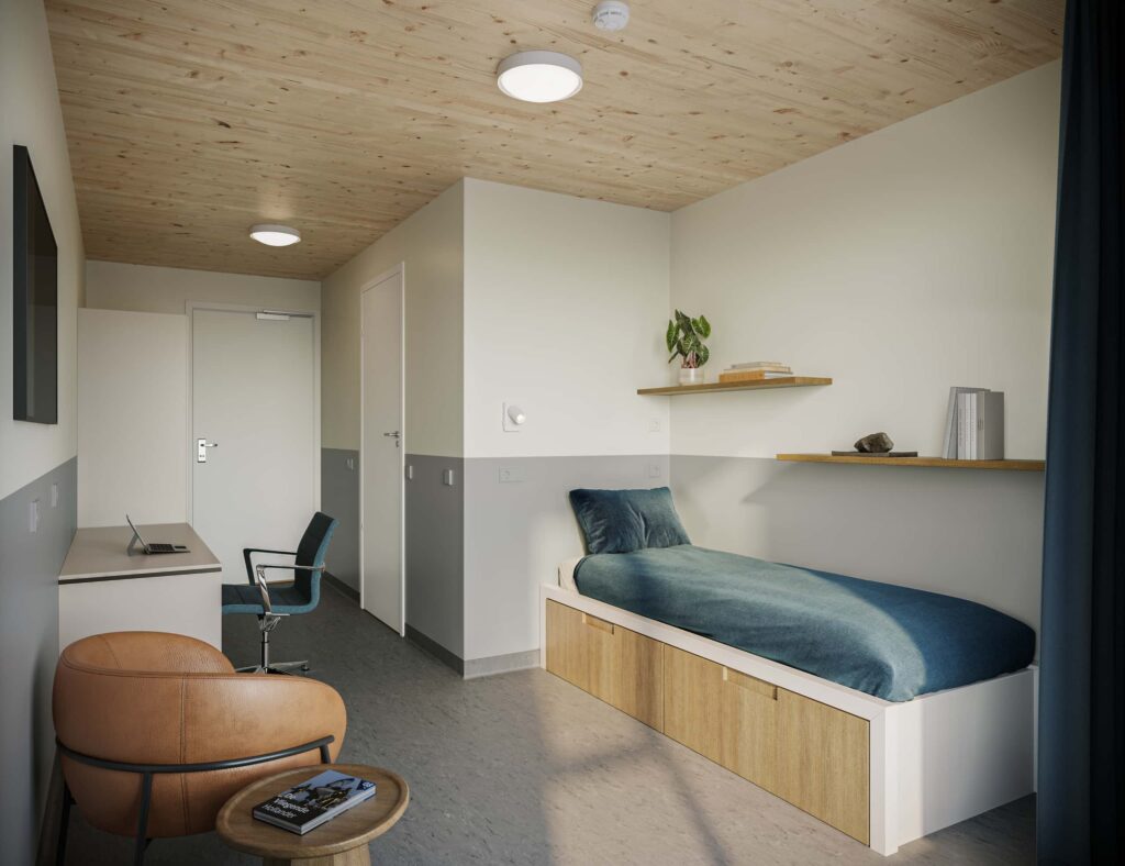 Kamer in het eerste legeringsgebouw voor 60 militairen op Vliegbasis Leeuwarden. Foto: Plegt-Vos.