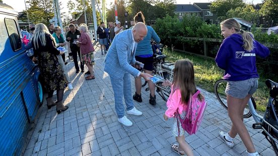 Wethouder Hein de Haan deelt lekkers uit aan de schoolkinderen in Warga