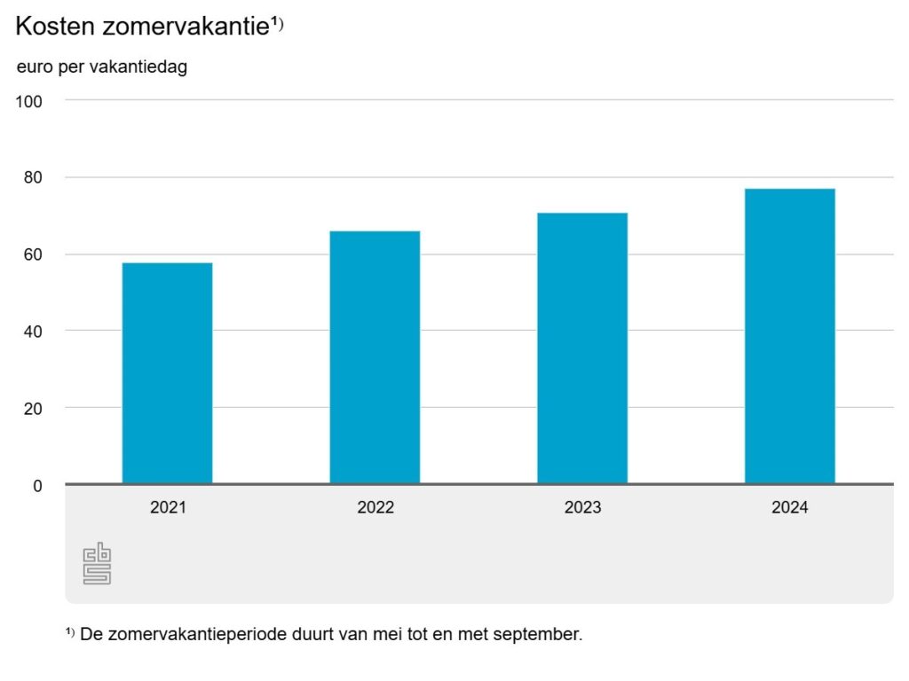 In de zomerperiode, die loopt van mei tot en met september, werd 15,3 miljard euro besteed aan vakanties. Dit komt neer op gemiddeld 1417 euro per vakantieganger. Per dag kostte een vakantie gemiddeld 77 euro. Dit bedrag is gestegen: in 2022 kostte een vakantie per dag nog 66 euro. De totale kosten van een zomervakantie stegen van 628 euro per persoon in 2022 tot 709 euro in 2024.