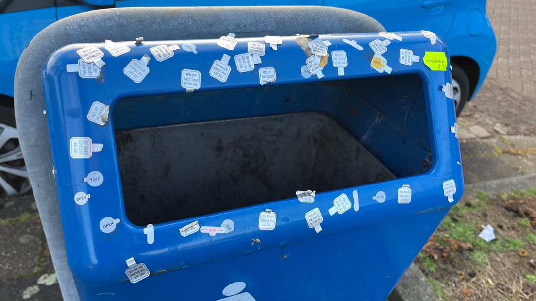 Het is een sport om de stickers van de vape-verpakking op afvalbakken te plakken